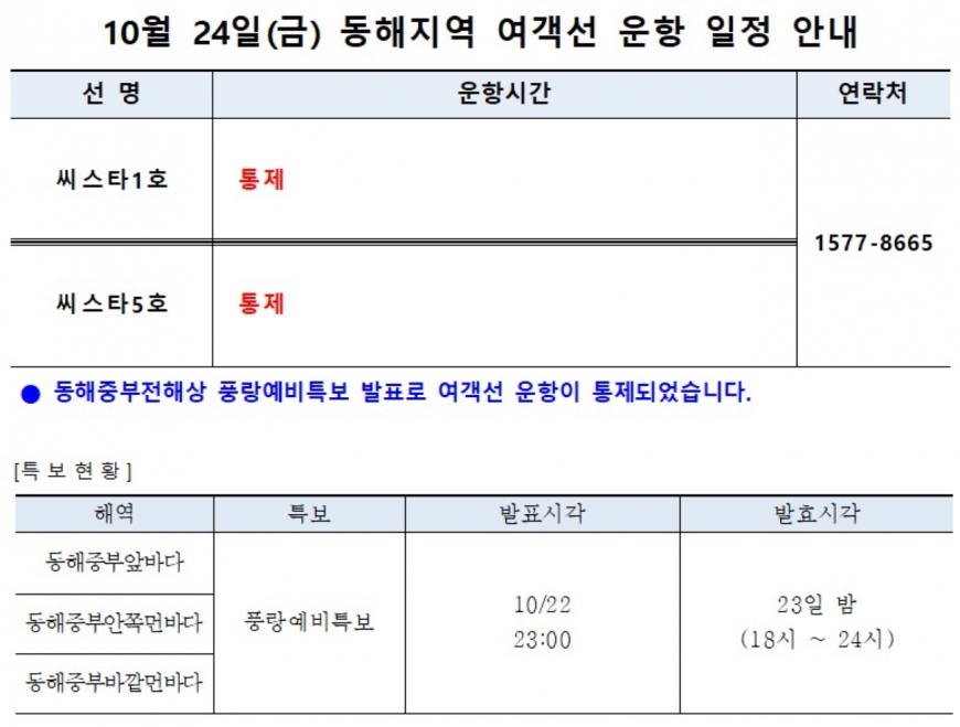 ◈ 10월 24일(금) 여객선 '결항' 안내 ◈ 풍랑특보가 발표되어 여객선 운항이 통제되었음을 알려드립니다.