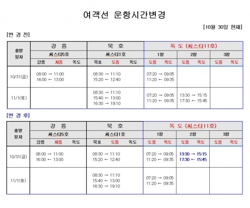 ■.2025년10월31일(금)서울.경기.인천↔동해시(묵호항) 여객터미널 배차정보 동해시(묵호항) 여객선 출항 시간 여객선명:(씨스타1호):정원:442명 ■.묵호(08:30분)→울릉(도동):(씨스타1호) ■.울릉(도동) (12:40분) →묵호:(씨스타1호) (제1호차) ■.부평역 북광장 (구)삼화고속 지하상가 새벽:02:20 ■.영등포신세계백화점정문 새벽:03:00 (제2호차) ■.서울시청역 2번출구 새벽:03:30 ■.잠실역4번출구 직진 100미터 롯데마트정문앞 새벽:04:00 상기지역외 셔틀버스 미운행 (예약손님없음) 입니다 버스탑승시에는 두레고속관광 버스 를 찾으신후 예약자대표자이름 .인원수 말씀후 승차하세요 ■.셔틀버스 (묵호항여객선터미널):최소출발인원안내 서울출발 :영등포(2명).서울시청역(2명).잠실역(2명):확정 경기권 :(안양(10명).수원(10명):출발인원:확정 인천지역 :(송내역(8명).부평역(8명):출발인원:확정
