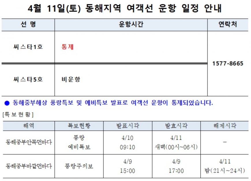 ◈ 2026년 04월 11일 (토) 여객선 '결항' 안내 ◈ 풍랑특보가 발표되어 여객선 운항이 통제되었음을 알려드립니다.