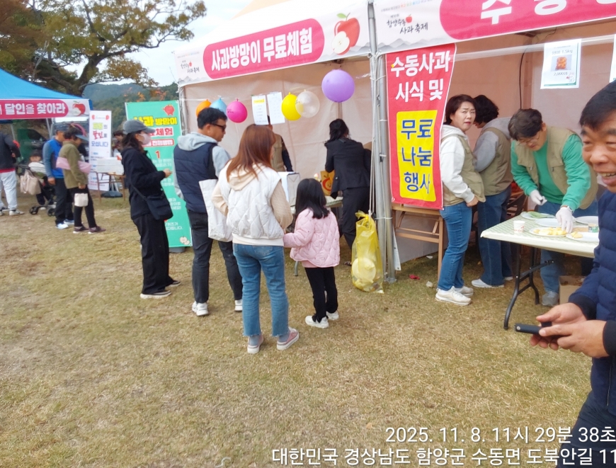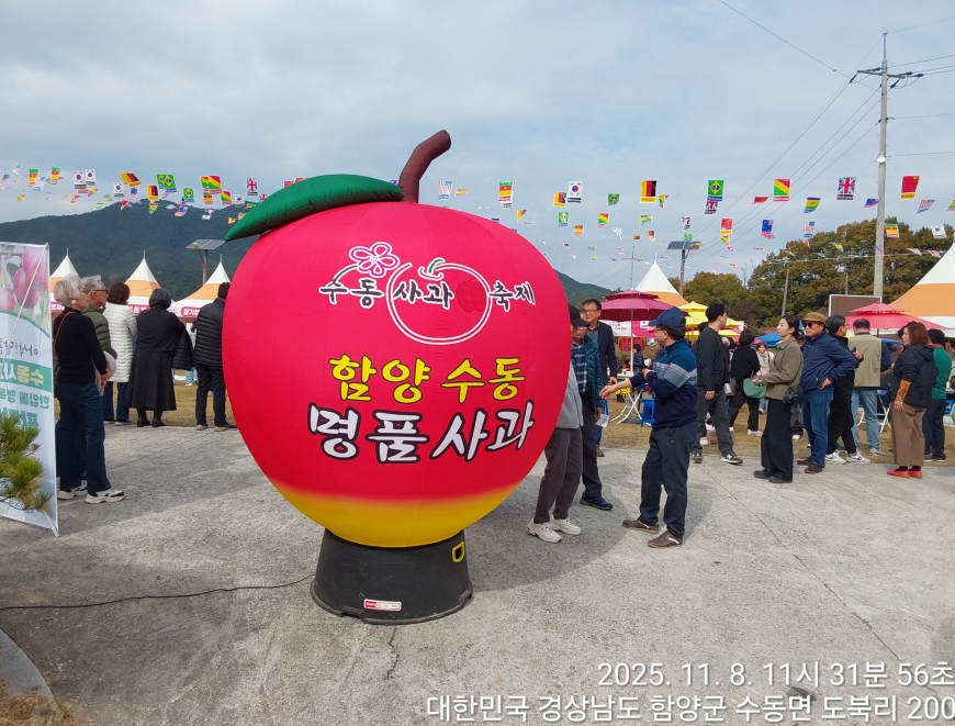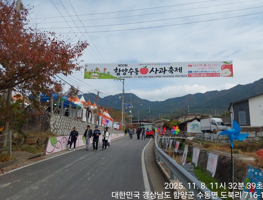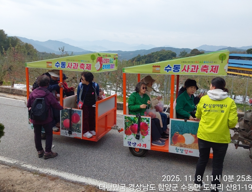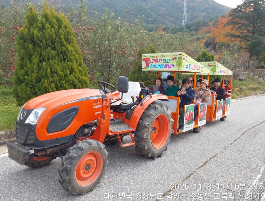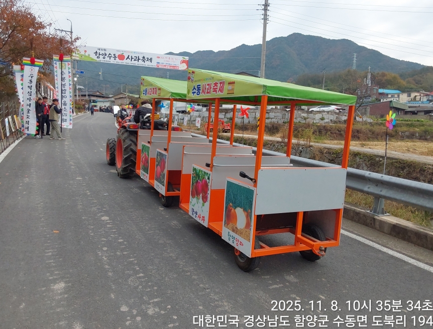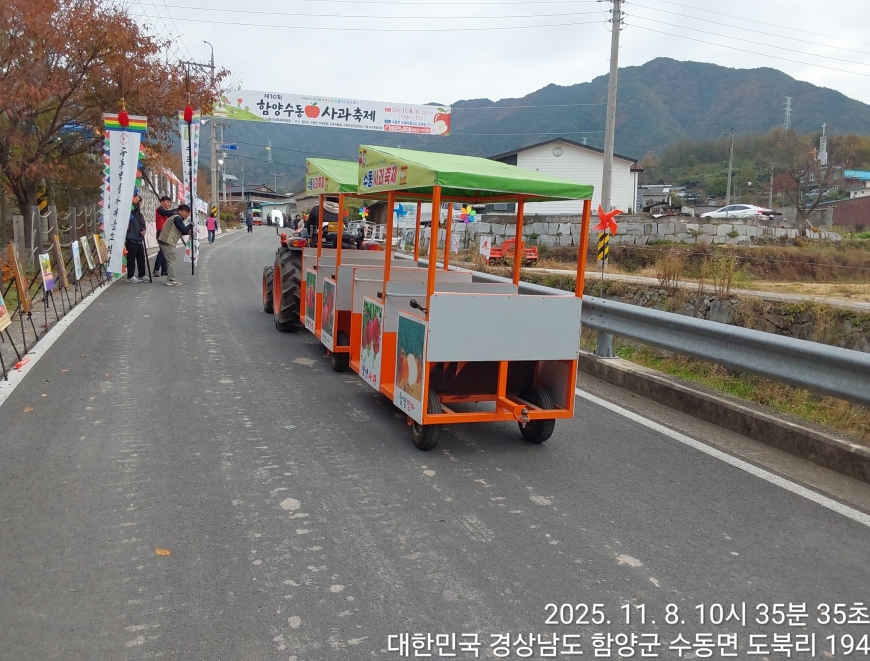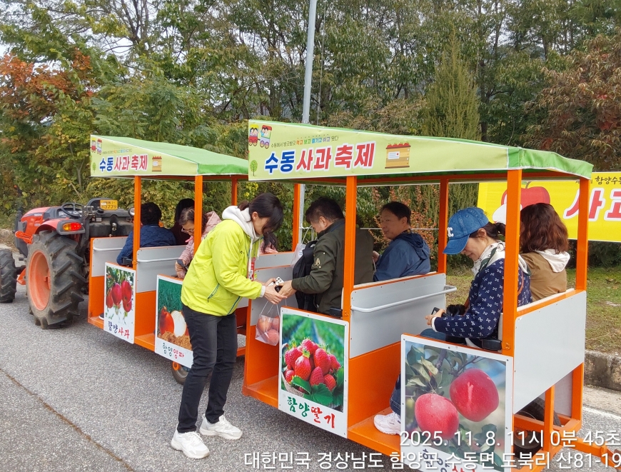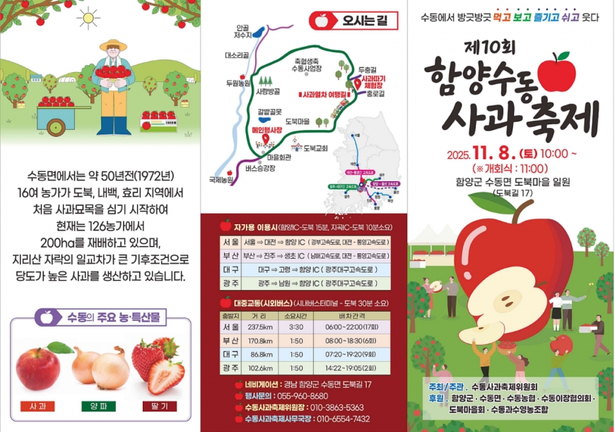[경상남도 함양군] 수동면 사과축제 함양선비문화길 거연정 출발 농원정 도착 출발일자:2025-11-08(토) 제10회 함양수동사과축제’가 11/8(토)일 함양군 수동면 도북마을에서 열린다. 이번 축제는 가을의 끝자락에서 풍성한 먹거리와 즐길 거리로 가득 채워질 예정이며, 그동안 많은 사랑을 받아온 축제답게 다양한 체험 프로그램과 즐거운 행사들이 준비되어 있다. 축제 방문객들은 달콤한 사과와 함께하는 특별한 경험을 할 수 있다. 사과따기 체험에서는 방문객들이 직접 사과를 따고, 사과열차를 타고 사과 향이 가득한 과수원길을 돌아보며 아름다운 가을 풍경을 만끽할 수 있다.