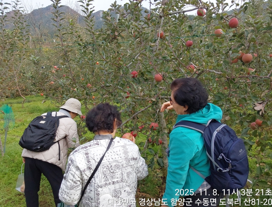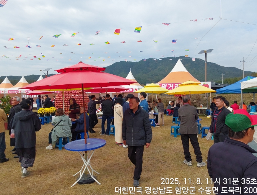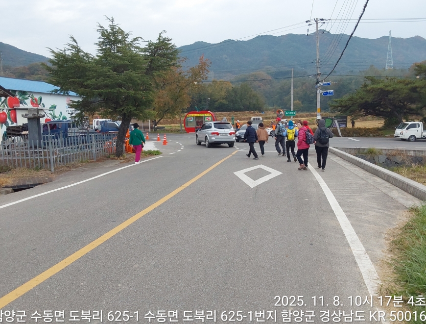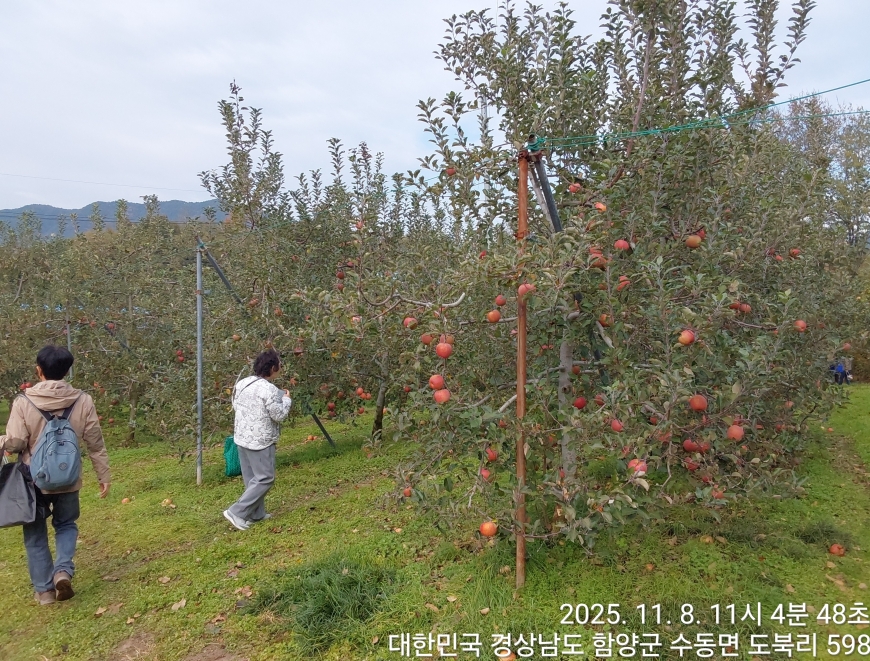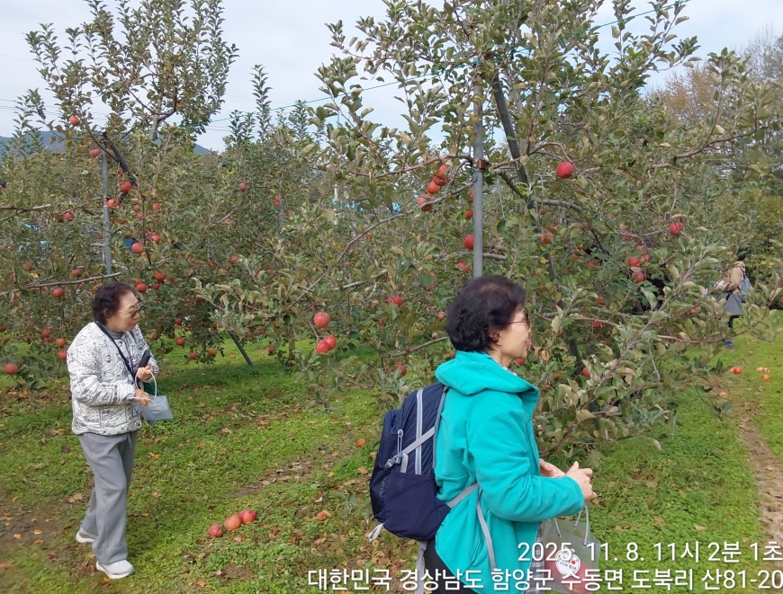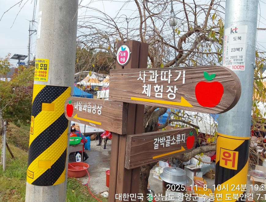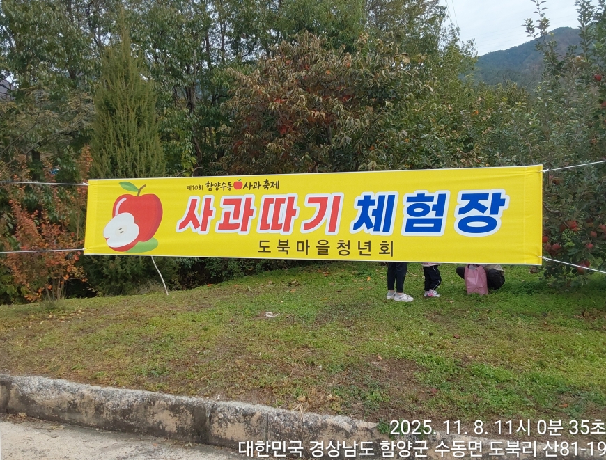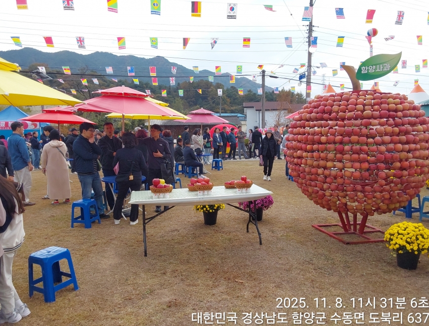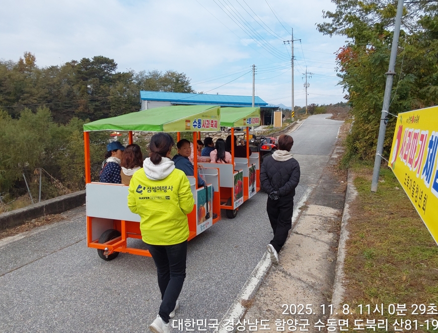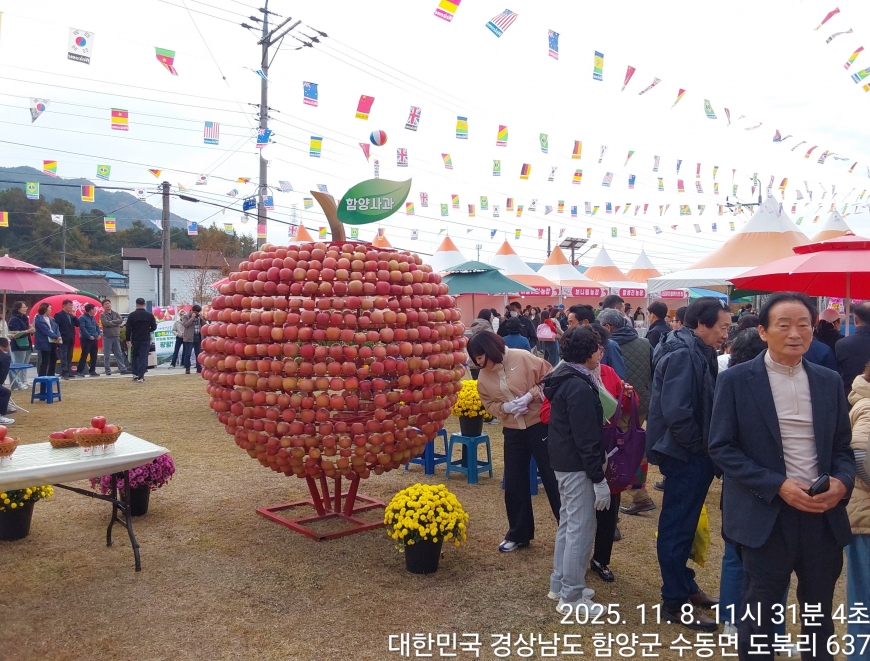[경상남도 함양군] 수동면 사과축제 함양선비문화길 거연정 출발 농원정 도착 출발일자:2025-11-08(토) 제10회 함양수동사과축제’가 11/8(토)일 함양군 수동면 도북마을에서 열린다. 이번 축제는 가을의 끝자락에서 풍성한 먹거리와 즐길 거리로 가득 채워질 예정이며, 그동안 많은 사랑을 받아온 축제답게 다양한 체험 프로그램과 즐거운 행사들이 준비되어 있다. 축제 방문객들은 달콤한 사과와 함께하는 특별한 경험을 할 수 있다. 사과따기 체험에서는 방문객들이 직접 사과를 따고, 사과열차를 타고 사과 향이 가득한 과수원길을 돌아보며 아름다운 가을 풍경을 만끽할 수 있다.