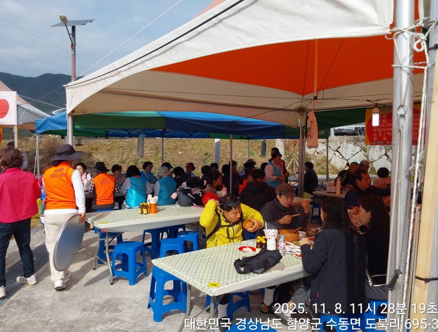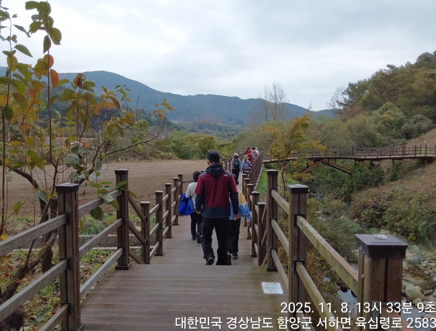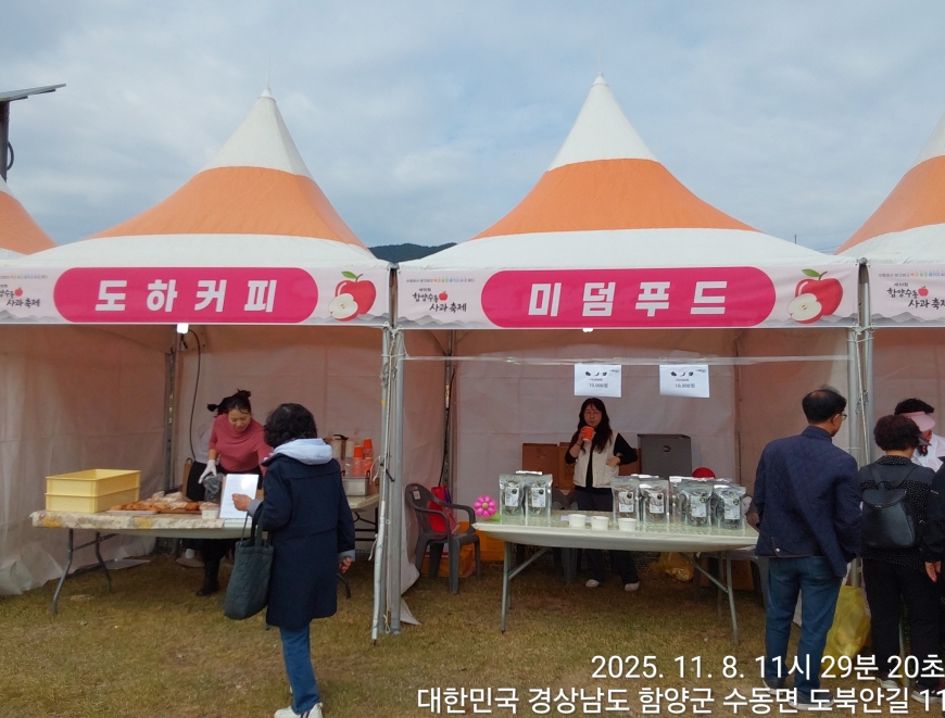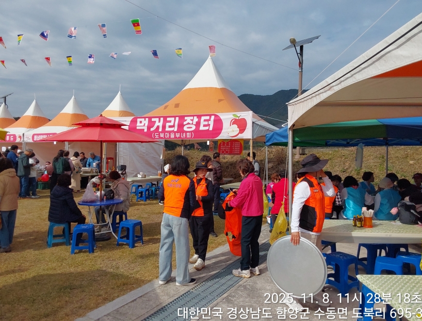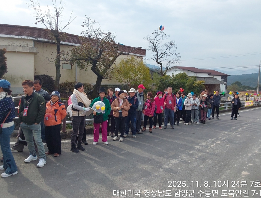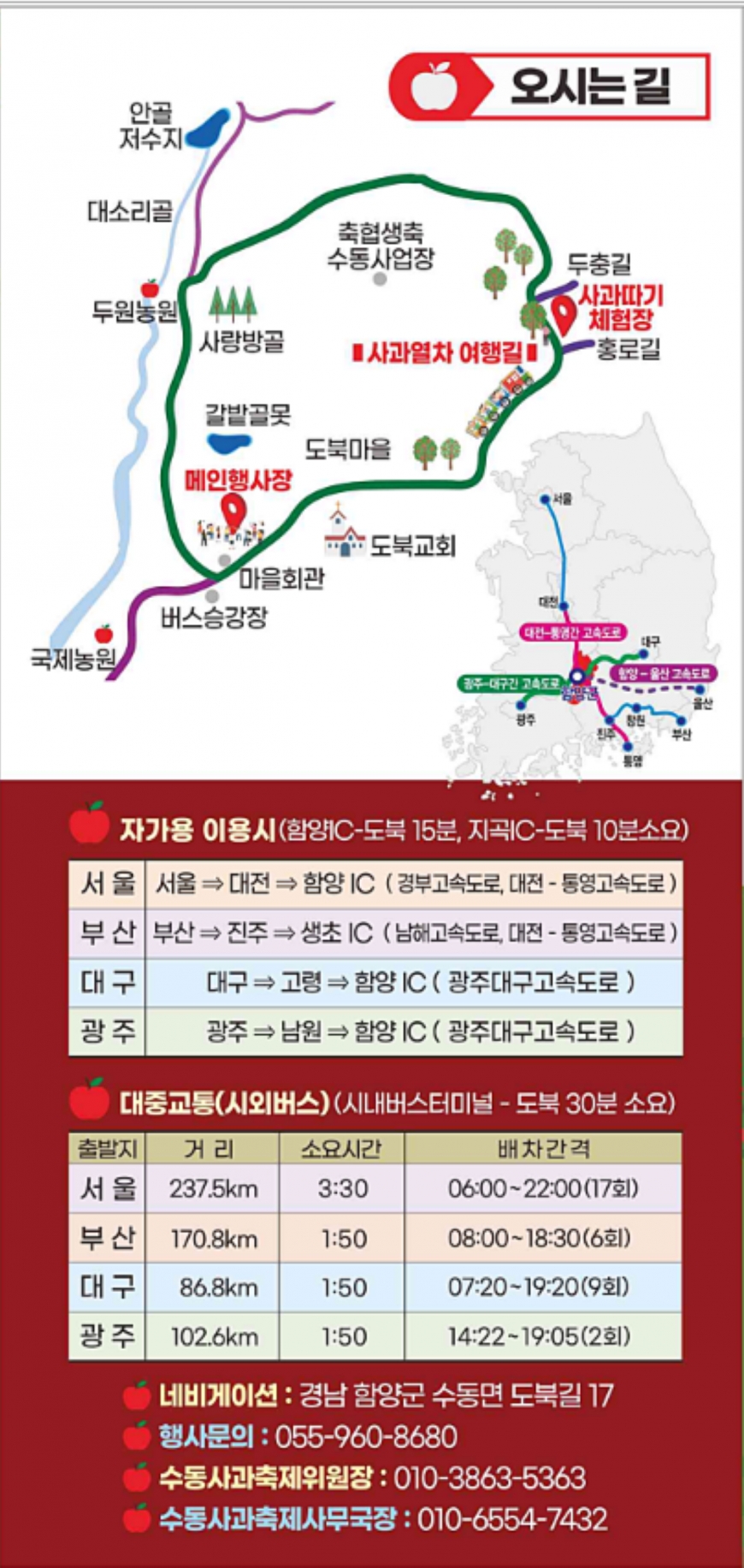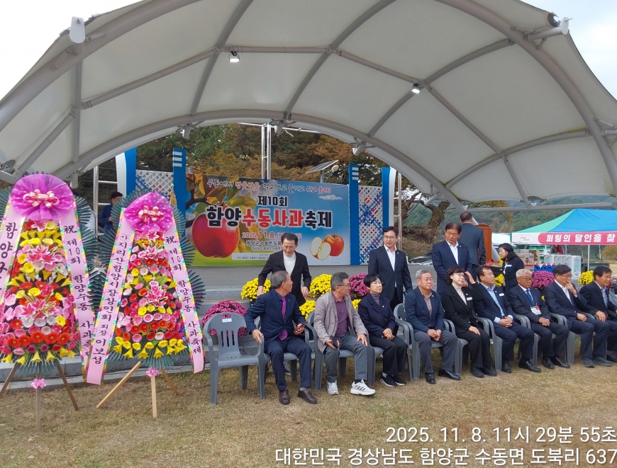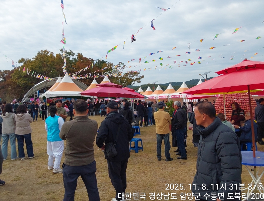 [경상남도 함양군] 수동면 사과축제 함양선비문화길 거연정 출발 농원정 도착 출발일자:2025-11-08(토) 제10회 함양수동사과축제’가 11/8(토)일 함양군 수동면 도북마을에서 열린다. 이번 축제는 가을의 끝자락에서 풍성한 먹거리와 즐길 거리로 가득 채워질 예정이며, 그동안 많은 사랑을 받아온 축제답게 다양한 체험 프로그램과 즐거운 행사들이 준비되어 있다. 축제 방문객들은 달콤한 사과와 함께하는 특별한 경험을 할 수 있다. 사과따기 체험에서는 방문객들이 직접 사과를 따고, 사과열차를 타고 사과 향이 가득한 과수원길을 돌아보며 아름다운 가을 풍경을 만끽할 수 있다.