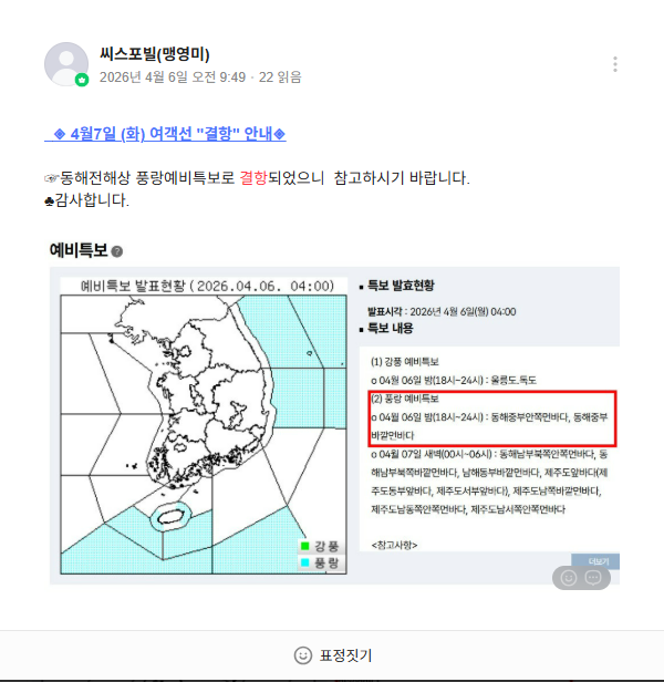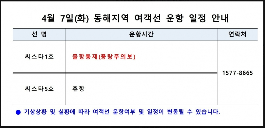 ◈ 2026년 04월 07일 (화) 여객선 '결항' 안내 ◈ 풍랑특보가 발표되어 여객선 운항이 통제되었음을 알려드립니다.