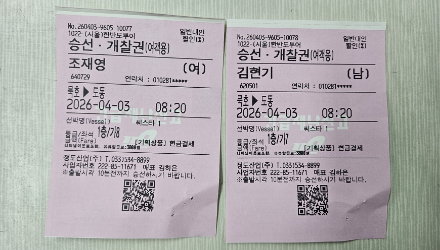 동해시 묵호항여객터미널 주차장 도착후 아침식사 를 합니다 묵호항여객선터미널도착후 배표받는방법 대합실1층 터미널매점 에서 에서 대표자 이름.인원 말씀후 배표받으세요 배표담당자:010-4258-5013 친절과정성을 다해 고객님을 모시겠습니다 서울--묵호 셔틀버스 새벽샌딩자: 010-3137-1312 ■.준비물:신분증 꼭 지참하세요 신분증 미지참시에는 여객선 승선이 거절됩니다 핸드폰 카메라 로 찍은 신분증 절대 승선불가 합니다 울릉도독도전문회사 서울한반도투어 주말 휴일.야간상담가능 (07:00~ 21:30) TEL:02-777-8883