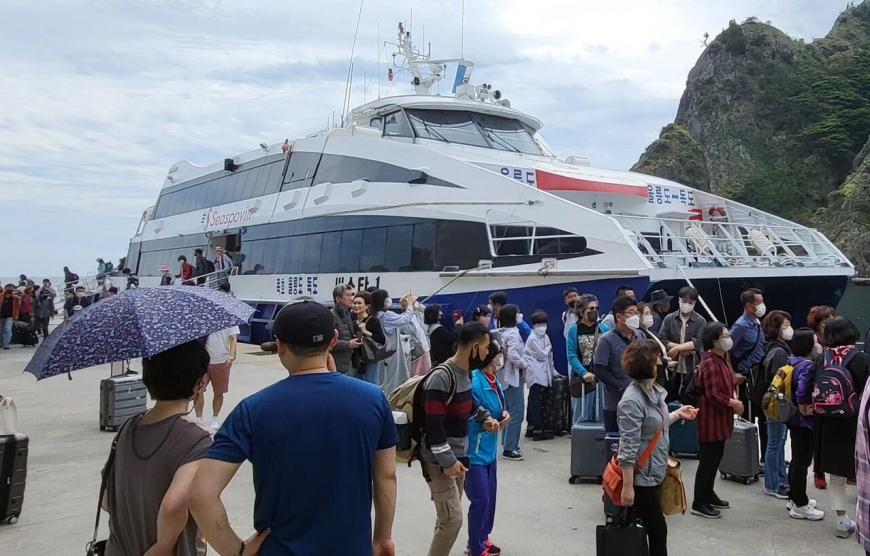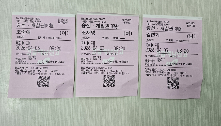 동해시 묵호항여객터미널 주차장 도착후 아침식사 를 합니다 묵호항여객선터미널도착후 배표받는방법 대합실1층 터미널매점 에서 에서 대표자 이름.인원 말씀후 배표받으세요 배표담당자:010-4258-5013 친절과정성을 다해 고객님을 모시겠습니다 서울--묵호 셔틀버스 새벽샌딩자: 010-3137-1312 ■.준비물:신분증 꼭 지참하세요 신분증 미지참시에는 여객선 승선이 거절됩니다 핸드폰 카메라 로 찍은 신분증 절대 승선불가 합니다 울릉도독도전문회사 서울한반도투어 주말 휴일.야간상담가능 (07:00~ 21:30) TEL:02-777-8883